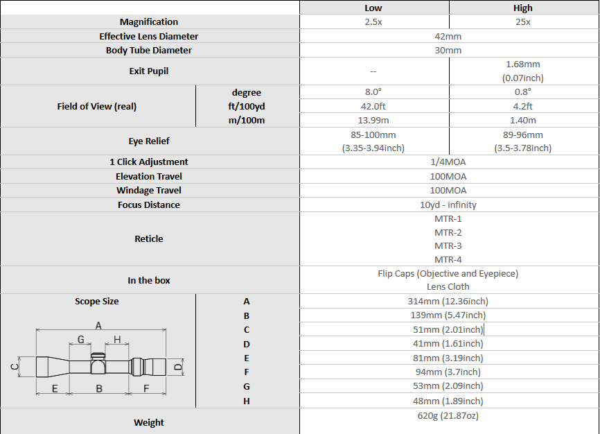 2.5-25x42mm - MOA Calibrated Reticles - Covered Knobs - 1/4 MOA Clicks